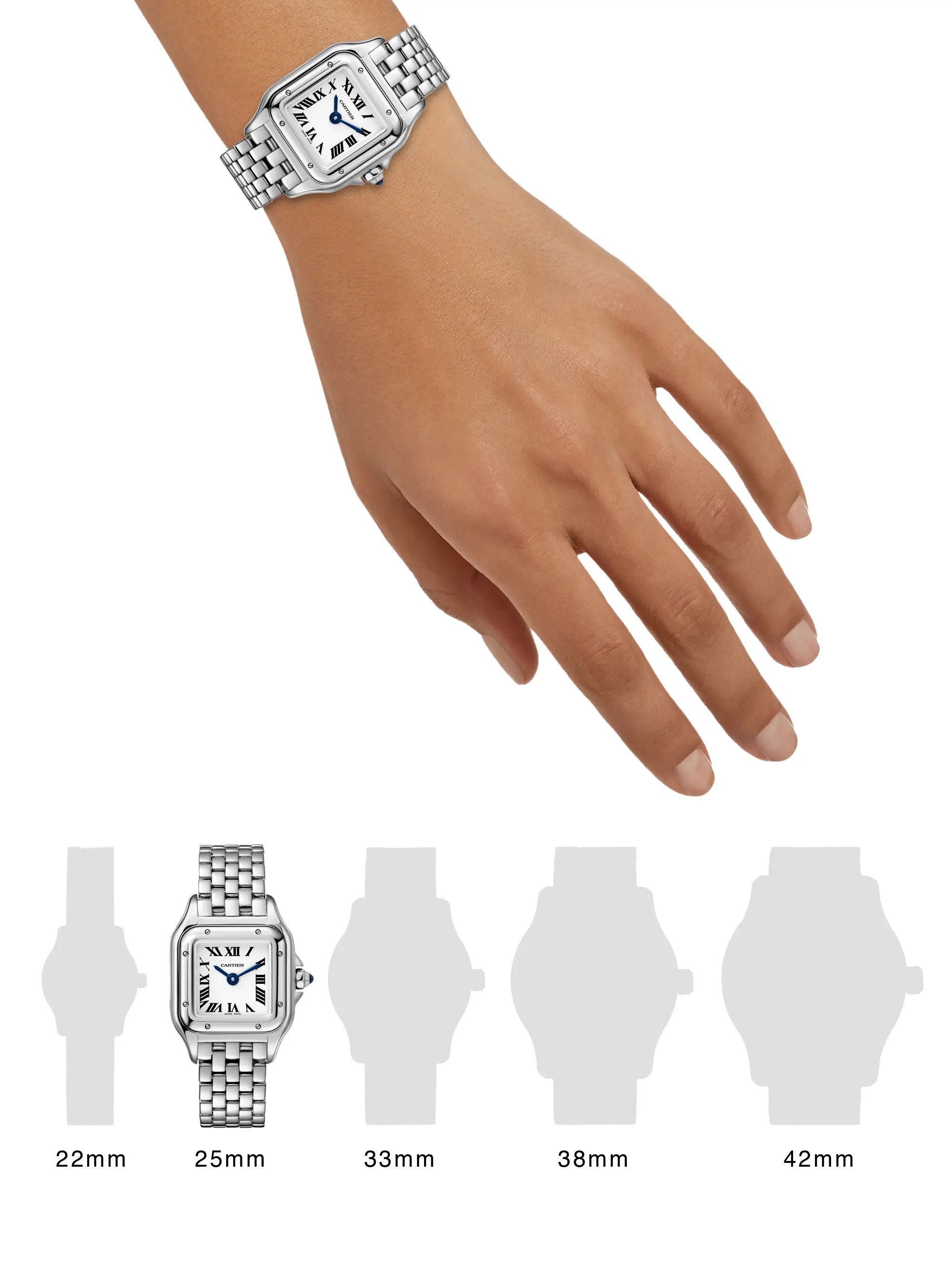 Panthère de cartier watch, mini model, quartz movement. Panthère de cartier watch, mini model, quartz movement. 18k yellow gold octagonal crown set with a sapphire cabochon. Panthère de cartier watch, mini model, quartz movement. 20 mm x 25 mm. Add engraving request price unavailable online add to shopping bag add to. 25 mm x 21 mm, thickness: Panthère de cartier watch, mini model, quartz movement. Gehäuse und armband aus stahl. A watch that is also a beautiful piece of jewelry... Gehäuse und armband aus stahl.